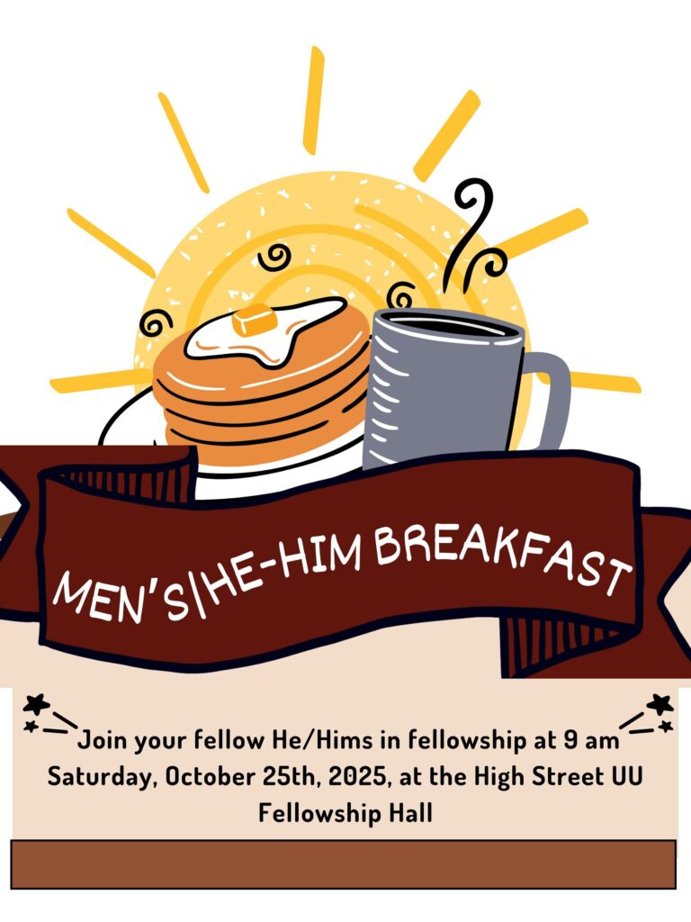 The Men’s Breakfast, usually held on the third Saturday of each month, has been moved from October 18th to October 25th this month. Same great company, conversation, and coffee—just one week later!