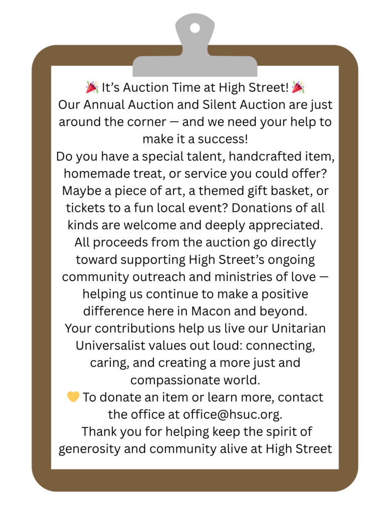 Happenings is a weekly publication of High Street Unitarian Universalist Church, proudly serving Macon, Georgia.